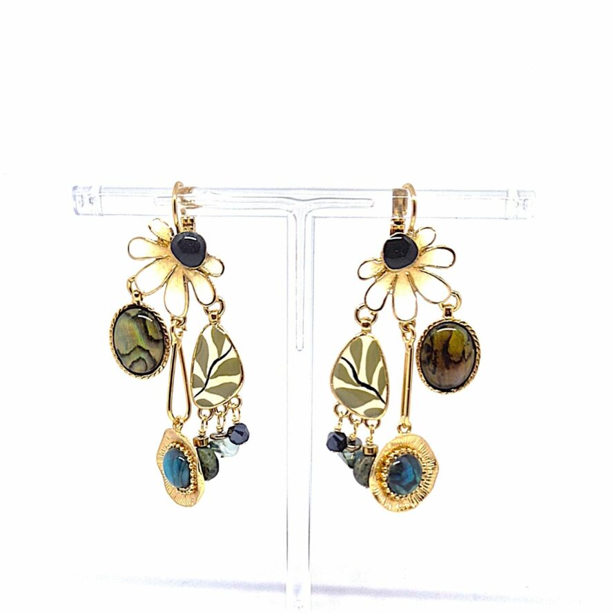 Dormeuses en bronze doré à l’or fin. Subtile mélange de pièces peintes à la et de pierres ( nacre et labradorite). Boucles lumineuses, aux couleurs douces et aux formes harmonieuses