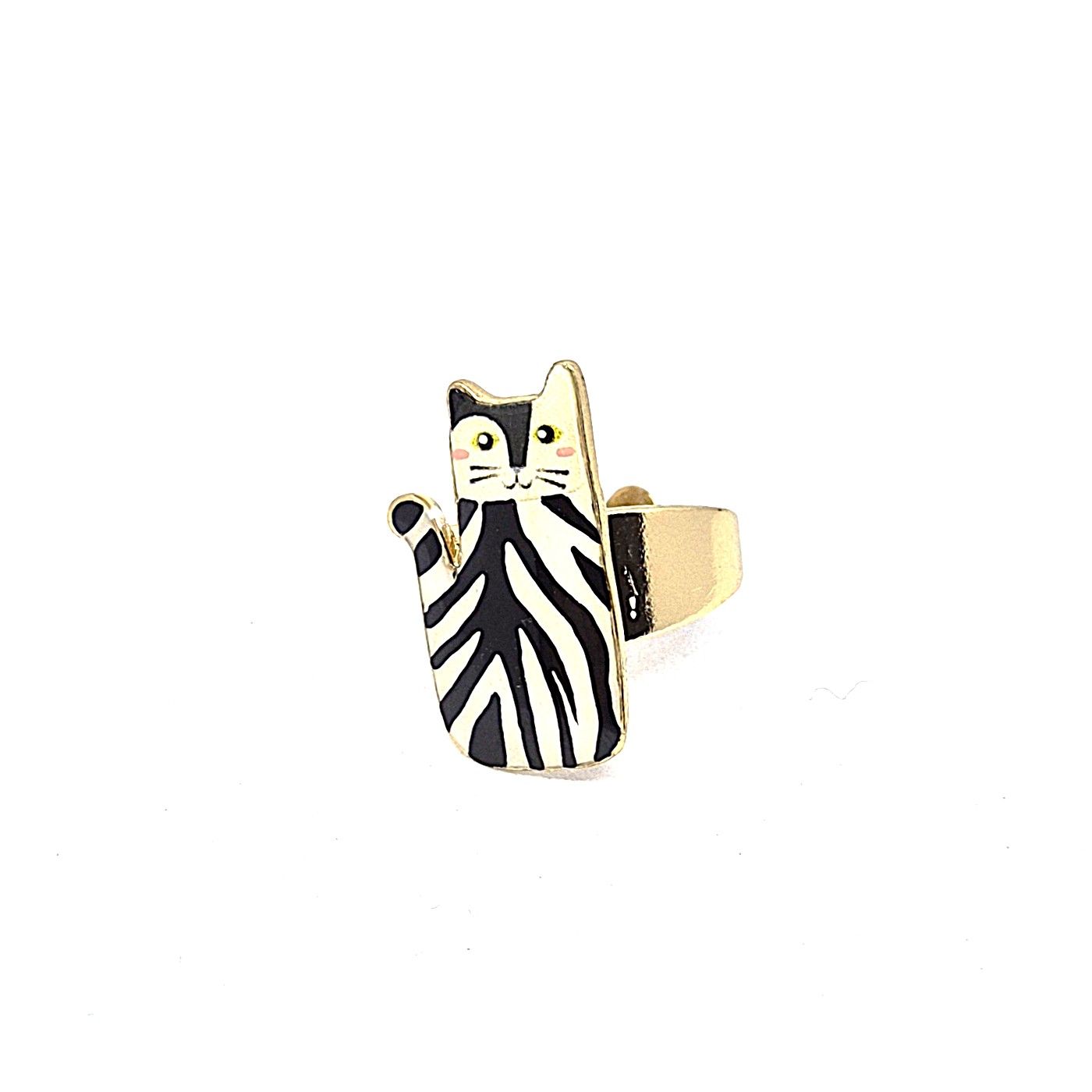 Bague réglable en laiton doré. L’élément principal représente Alfred, un gros matou dans les tons de noir et blanc. Tous les détails sont peints à la main.