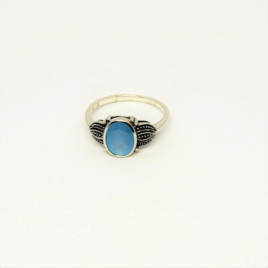 Bague argent 925 dans un style 1900, ciselé de chaque coté de la pierre . La calcédoine ovale (0.6 sur 0.8 cm) est facetté.