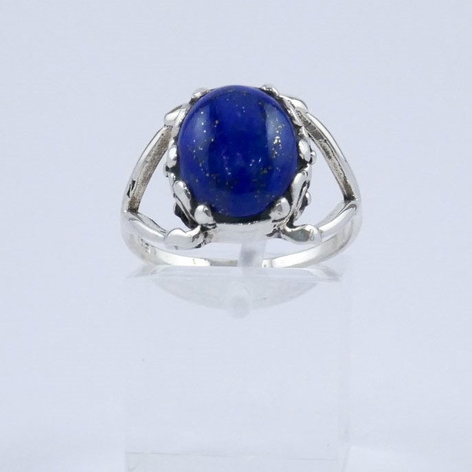 Bague  double fourche en argent avec un cabochon de lapis lazuli (1 sur 1.3 cm ) . le sertissage de  la pierre est gravé avec des motifs floraux de chaque coté