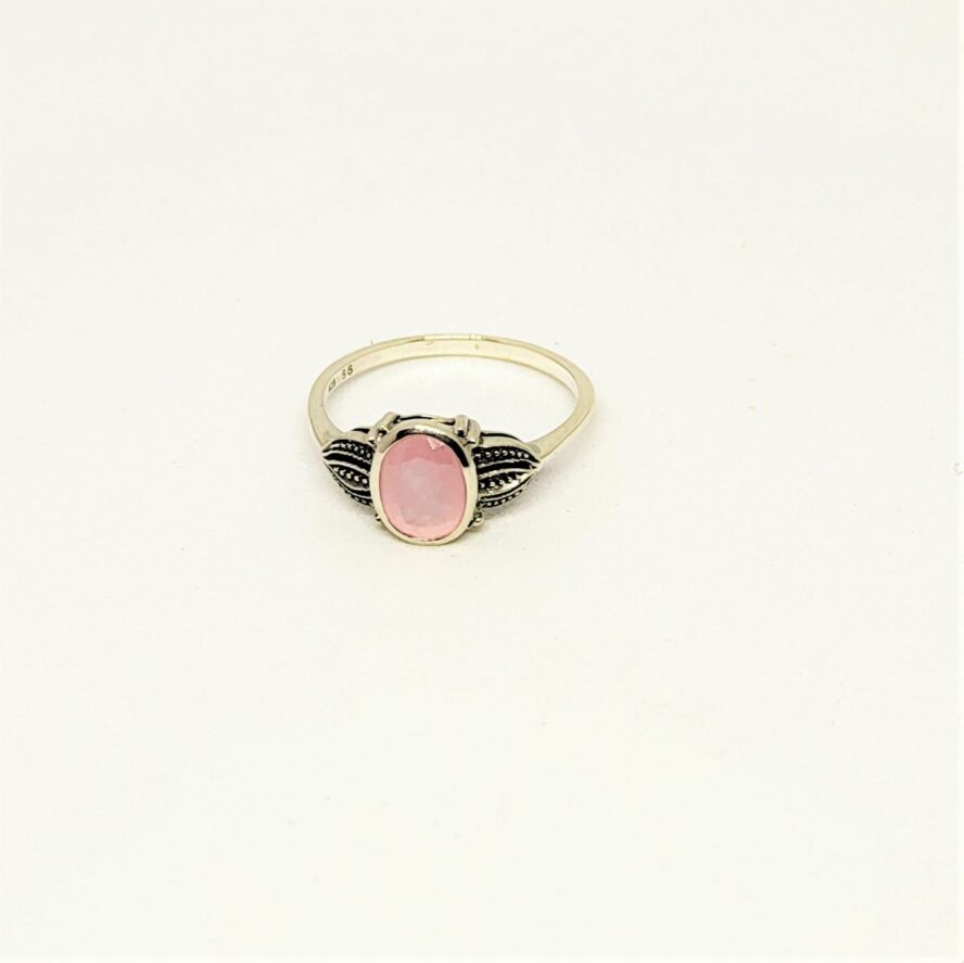 Bague argent 925 dans un style 1900, ciselé de chaque coté de la pierre . Le quartz rose ovale (0.6 sur 0.8 cm) est facetté.