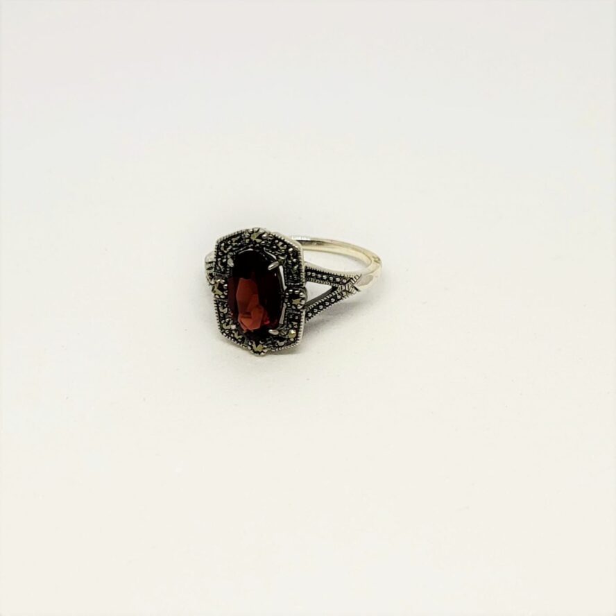 Bague argent 925 dans un style 1900, orné de marcassites autour de la pierre . Le grenat ovale (0.8 cm sur 1.1 cm) facetté est maintenu par 4 griffes.
