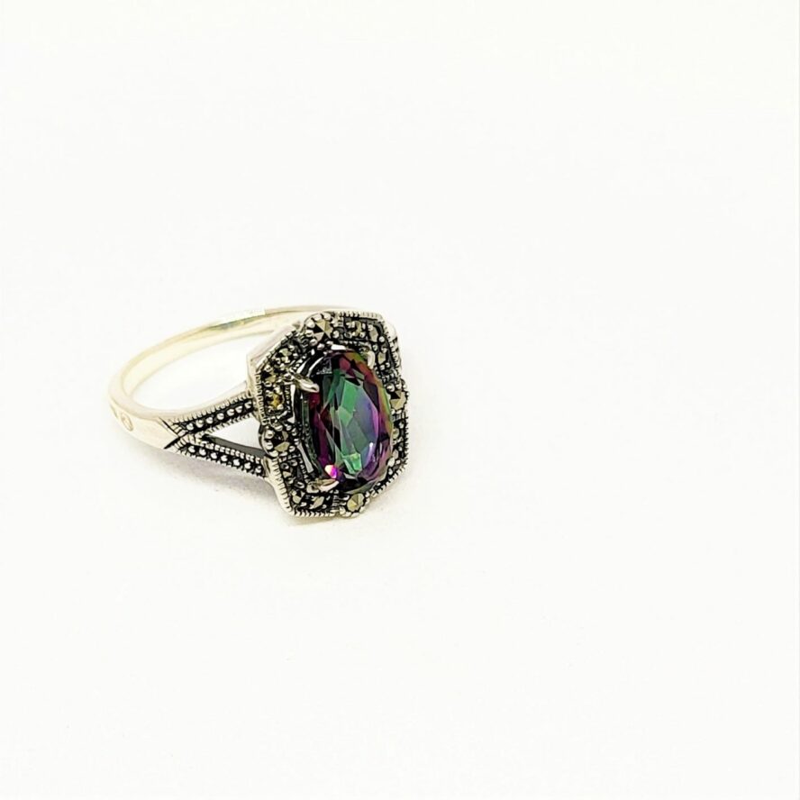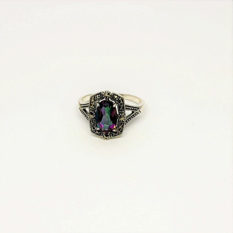 Bague rectangle style art déco , un joli Aqua aurora facetté est mis en valeur par la présence de marcassites et du délicat travail de l’argent.