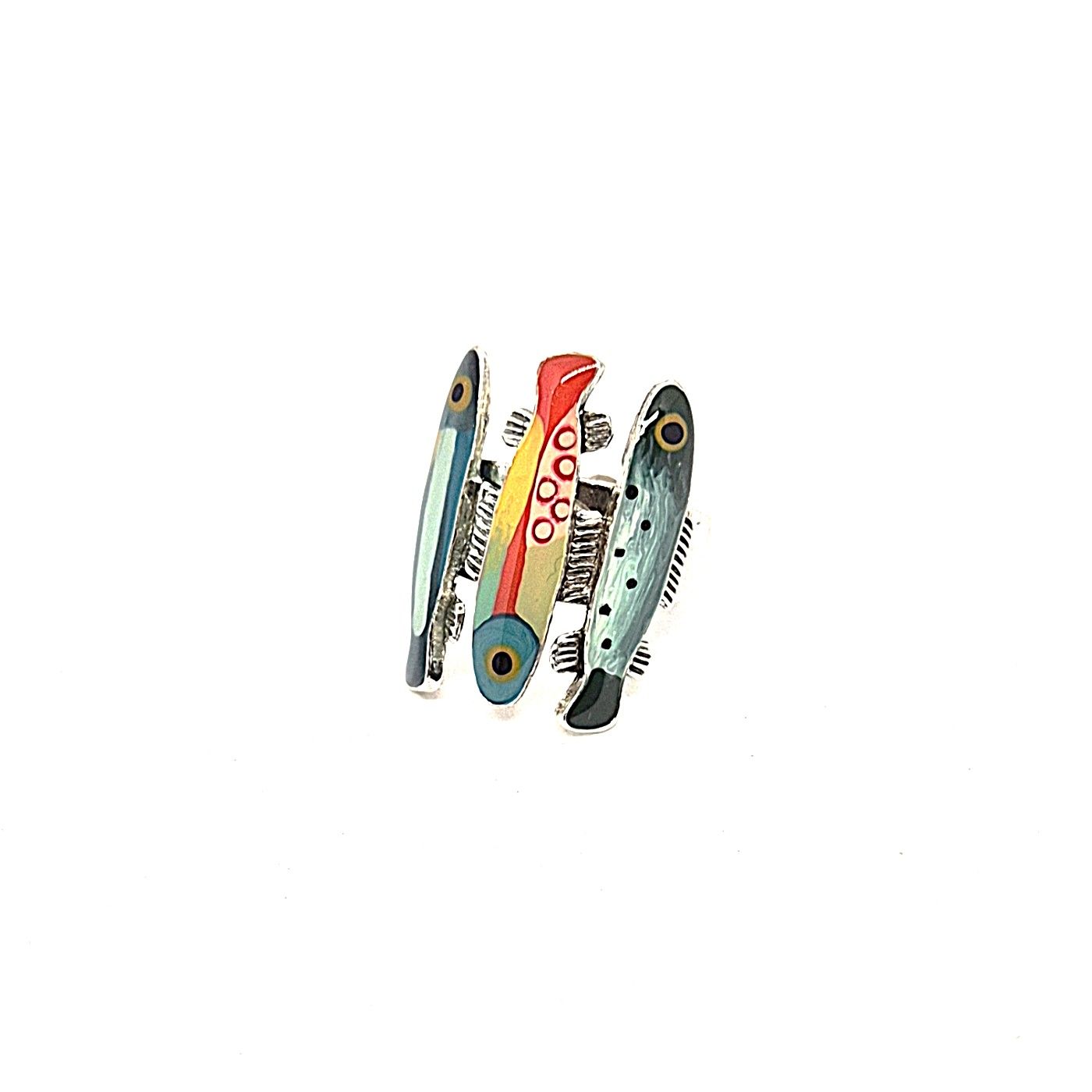 Bague réglable en bronze argenté , légèrement incurvée. Les poissons sont différents, chaque détails sont peints à la main en jouant avec les couleurs.