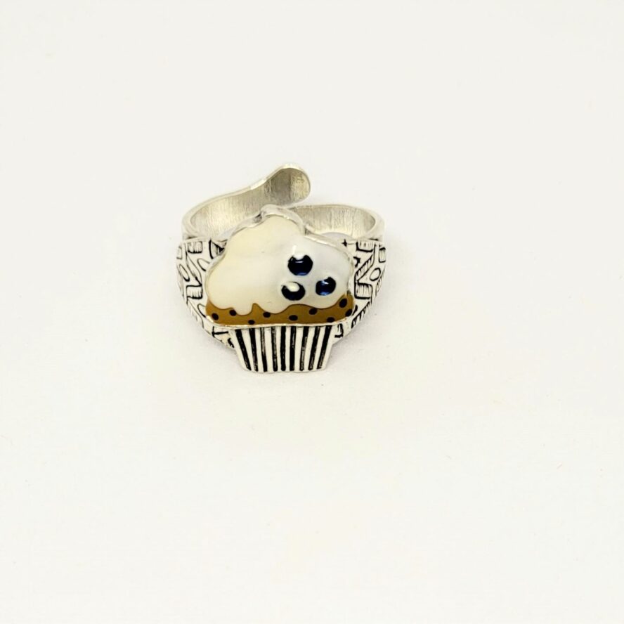 Bague réglable en bronze argenté. Le gâteau est peint à la main dans des teintes gourmandes et réhaussés de petits cristaux pour donner une touche de lumière.