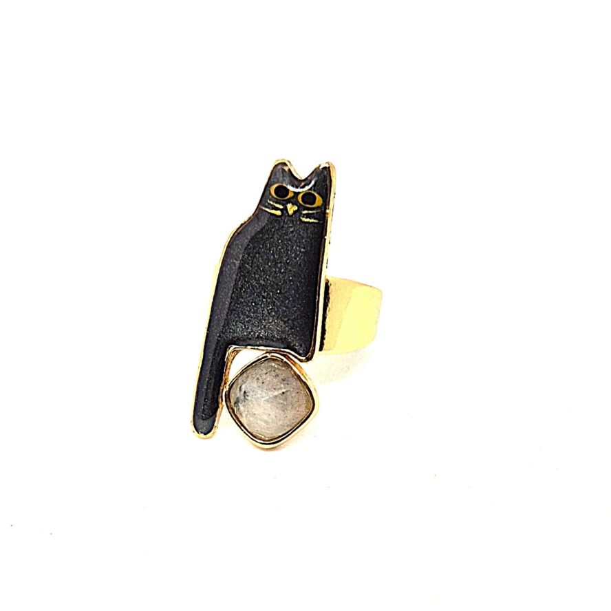 Bague réglable en bronze doré à l’or fin composé d’un beau chat noir peint à la main. Une labradorite facettée complète cette bague à l’univers mystique.