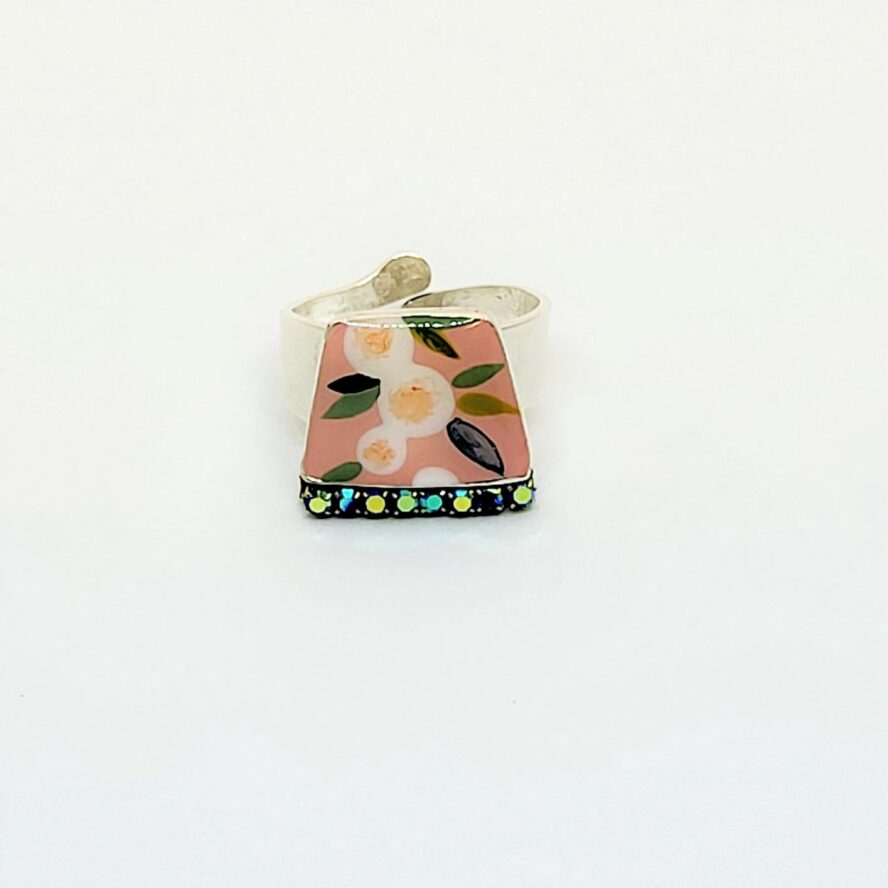 Bague réglable en bronze argenté. Les motifs principaux sont peints à la main, agrémenté de cristal irisé pour apporter de la lumière . Ensemble doux et printanier.