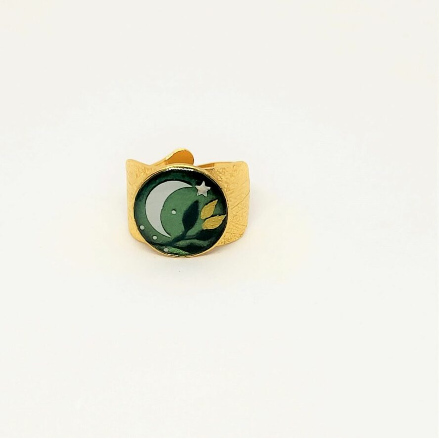 Bague réglable en bronze doré rondes , composées de poudre de mica prise sous résine . Elle est dans les teintes de vert , peintes à la main .