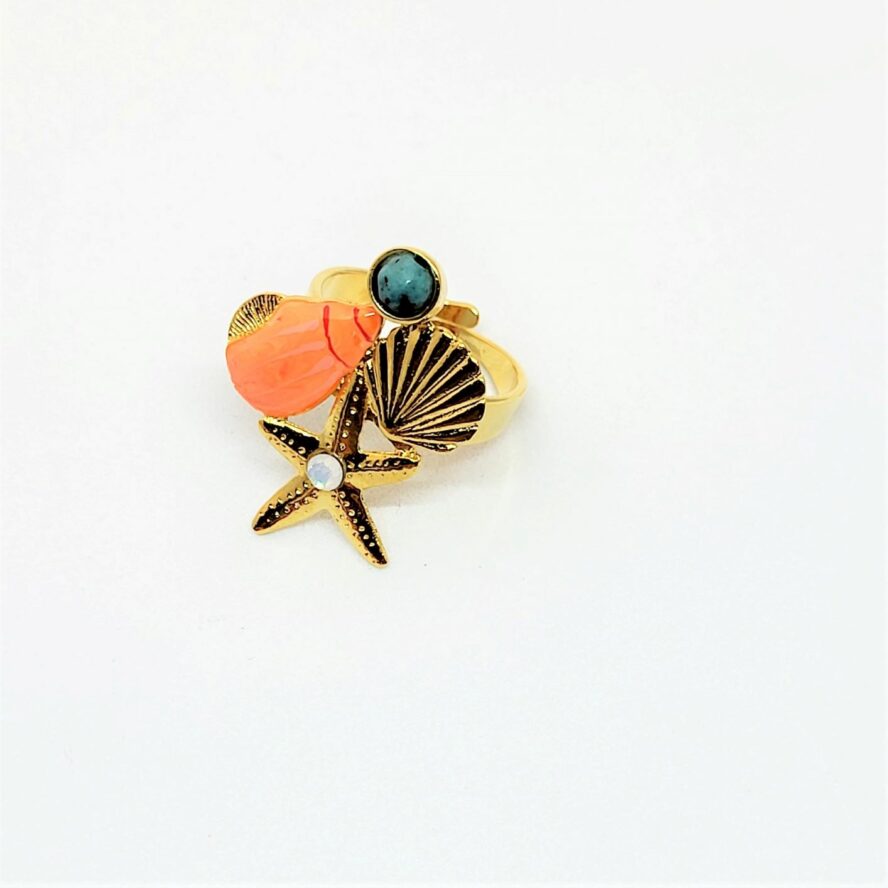 Bague réglable en bronze doré. La partie centrale est composée de différents éléments peints à la main avec des couleurs pastelles avec une petite perle d’apatite. Ensemble très doux.