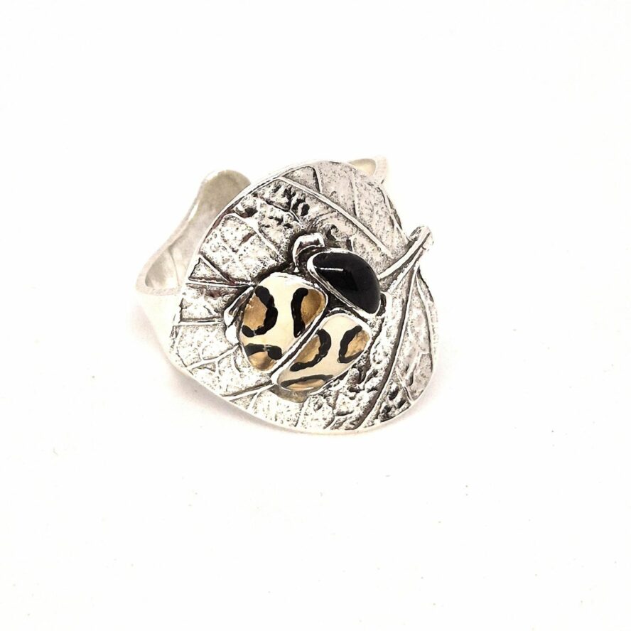 Bague réglable en bronze argenté représentant une feuille avec tous ces détails, sur laquelle une coccinelle beige avec des motifs léopard est posée. Elle est peinte à la main.