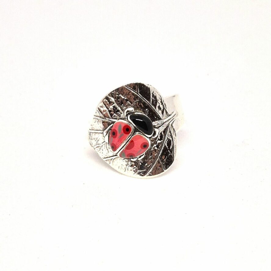 Bague réglable en bronze argenté représentant une feuille avec tous ces détails, sur laquelle une coccinelle rouge est posée. Elle est peinte à la main.