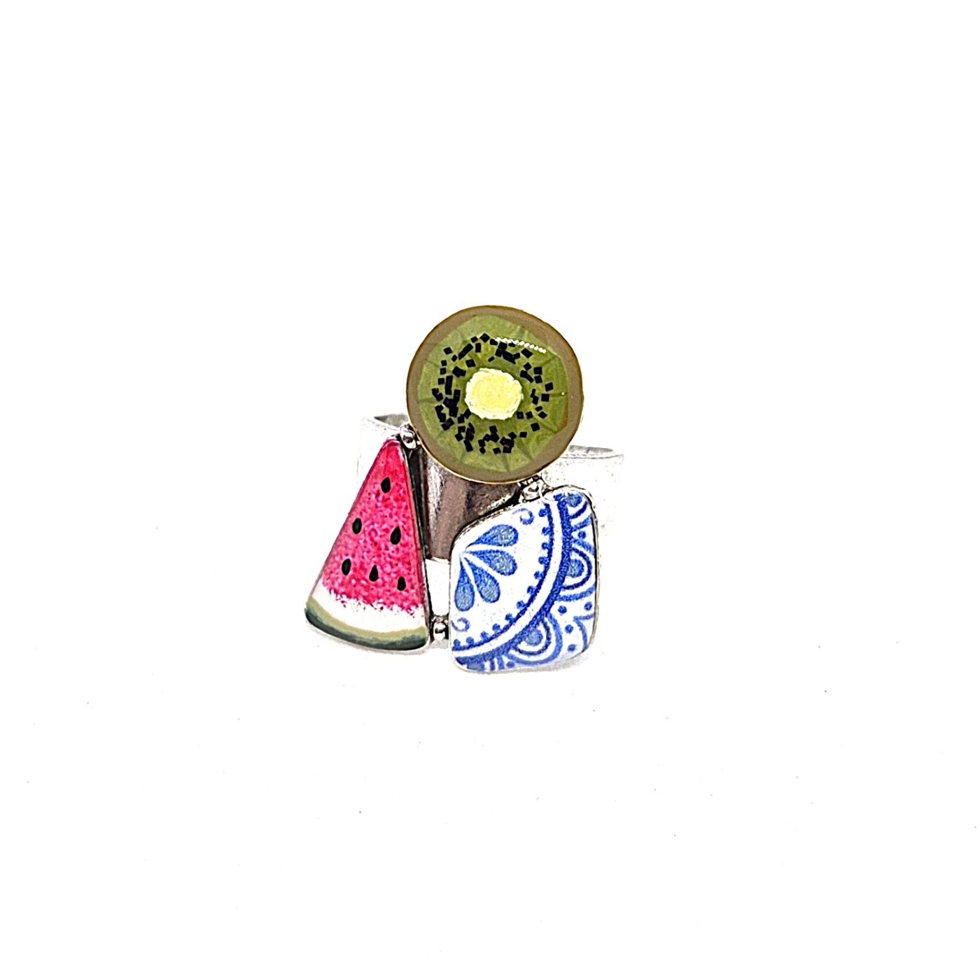 Bague réglable en bronze argenté. Une multitude de fruits y sont représentés Tous les éléments sont peints à la main.