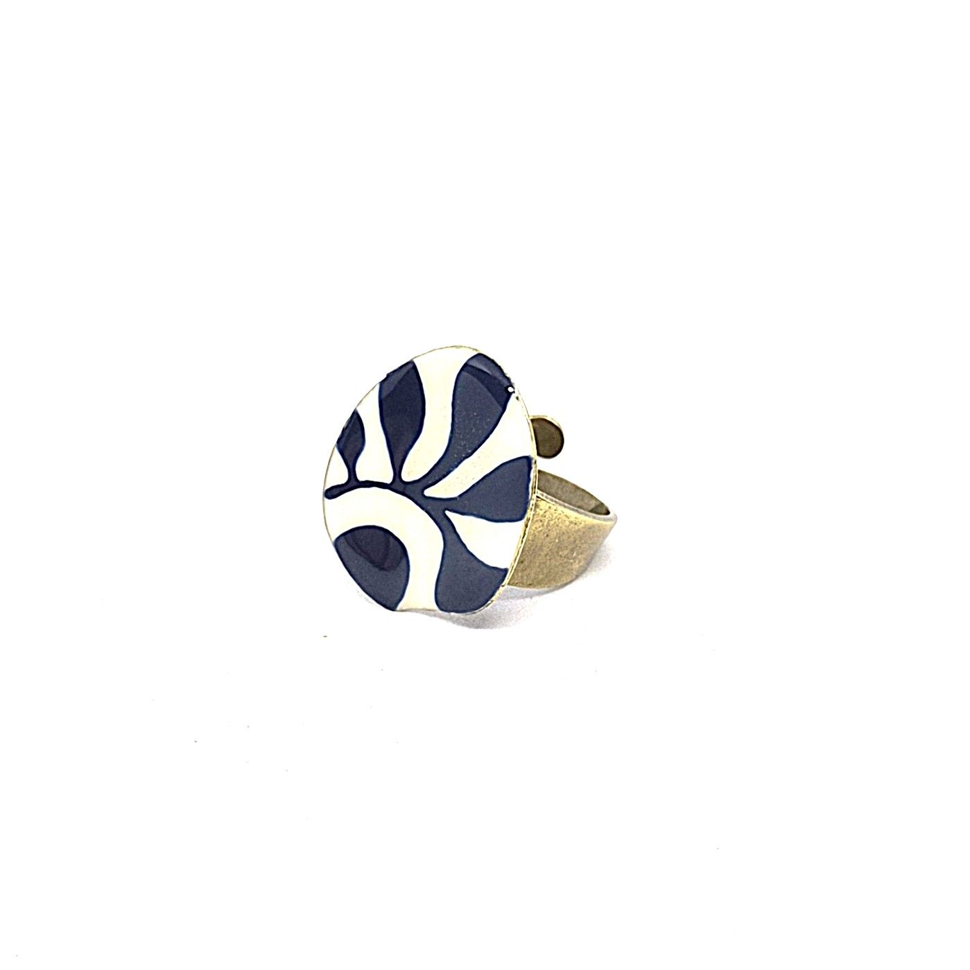 Bague réglable en bronze de forme ovale , légèrement incurvée. Tous les éléments sont peints à la main. La base de couleur crème fait ressortir le motifs harmonieux.