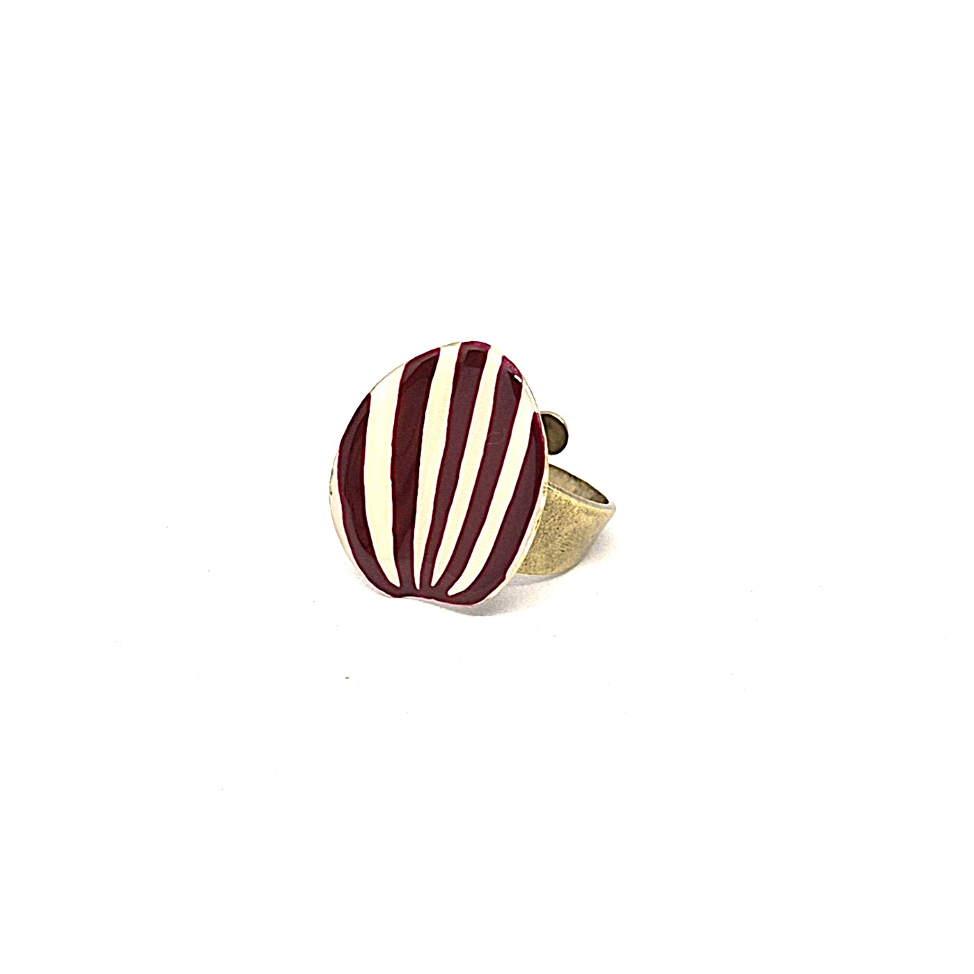 Bague réglable en bronze de forme ovale , légèrement incurvée. Tous les éléments sont peints à la main. La base de couleur crème fait ressortir le motifs harmonieux.