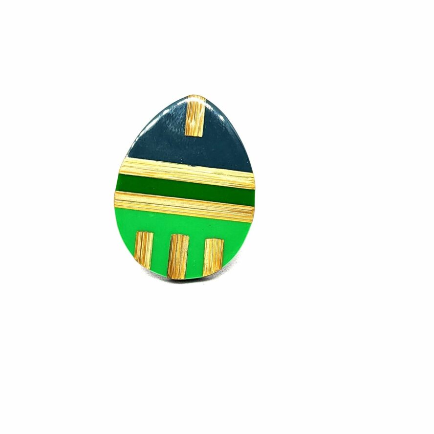 Bague réglable en bronze doré ovale. Ensemble très tonique et graphique par ces couleurs ( camaïeux de vert) et le mélange de matières ( résine et bambou).