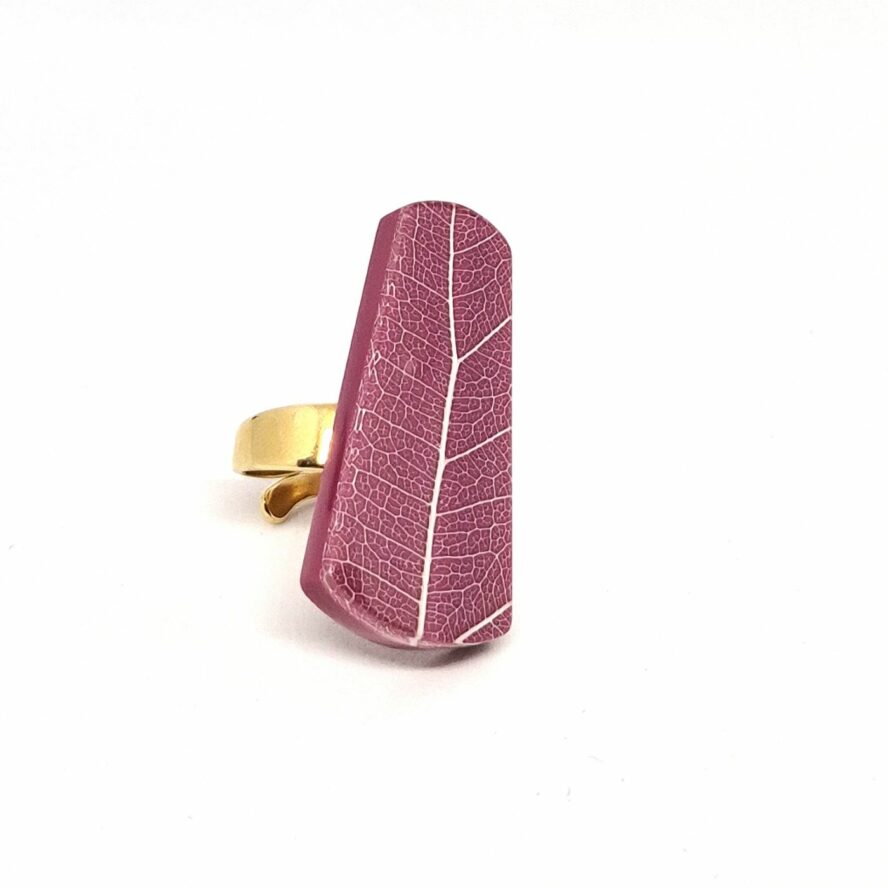 Bague réglable en bronze doré représentant un feuille prise sous une résine de couleur prune.