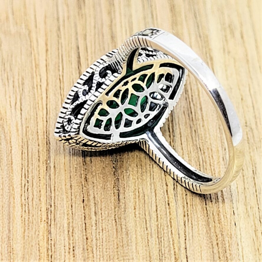 Bague rétro en argent de forme marquise , finement ciselée a sa base pour faire ressortir la couleur de la pierre centrale. Une jolie navette d’onyx vert donne des couleurs intenses et lumineuses grâce aux facettes de la pierre. De plus , la présence de marcassites sur le tout le tour de l’onyx vert ne fait que renforcer sa couleur .Modèle raffiné et intemporel
