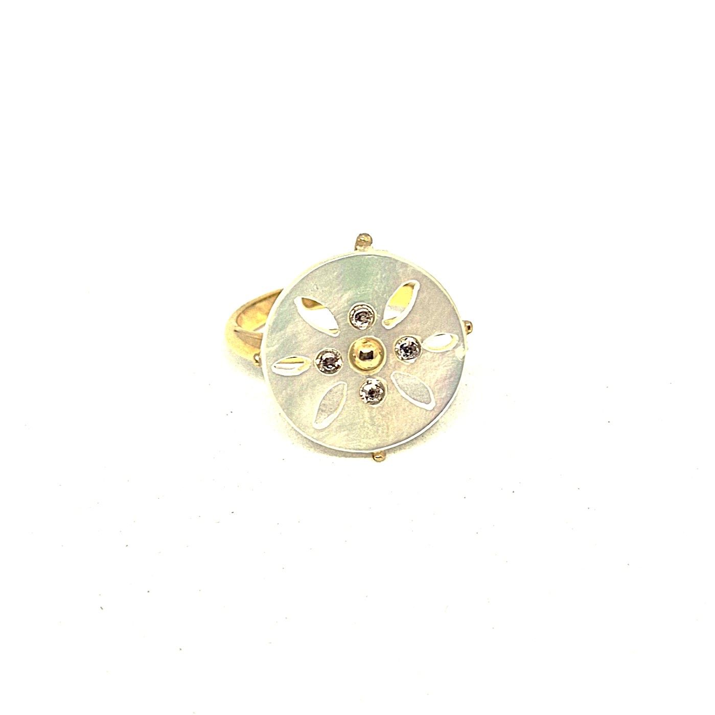 Bague réglable en laiton doré, mettant en évidence une pièce de nacre travaillé comme de la dentelle. La présence de cristal et des pointes dorées, renforce le travaille de dentelle.
