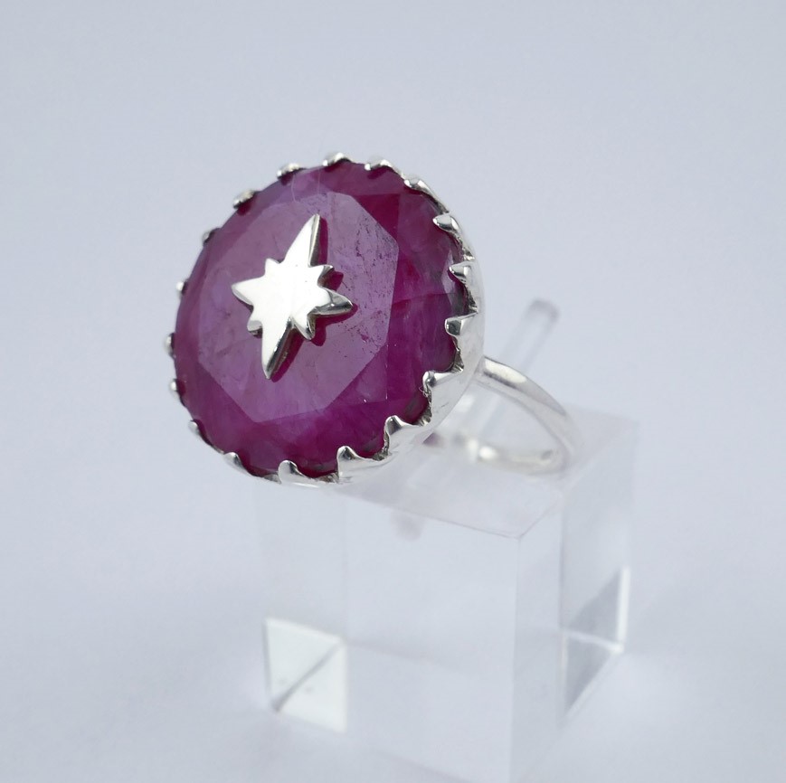 Bague rubis rond (1.7 cm de diametre ) serti d’argent dentelé , et avec en son centre un élément en argent