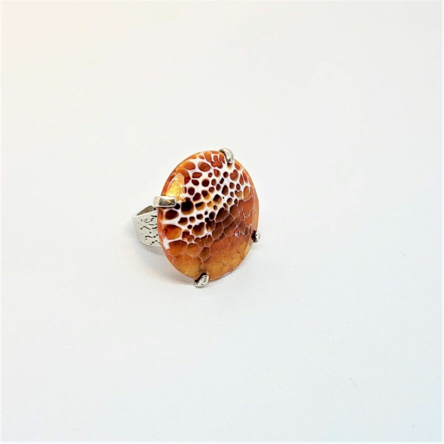 Bague réglable en bronze argenté avec un demi cabochon d’agate de feu facetté. Bague simple , brutes et lumineuse.