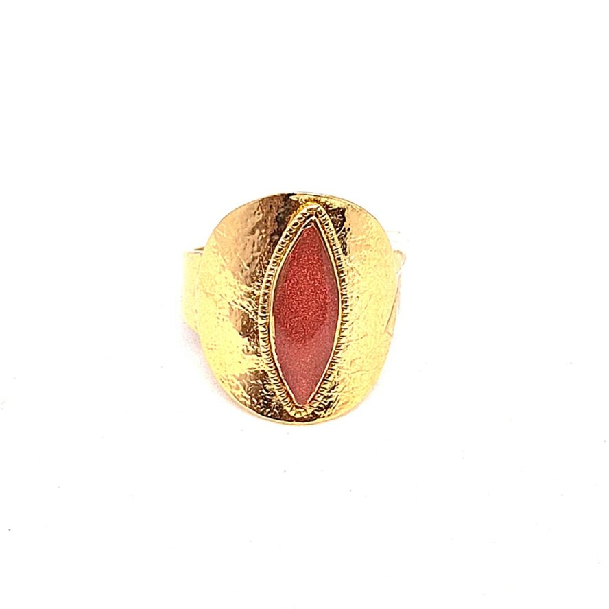 Bague réglable en bronze doré à l’or fin. Avec une pastille martelée, et un élément central avec de la poudre de mica, recouvert de résine terracotta.