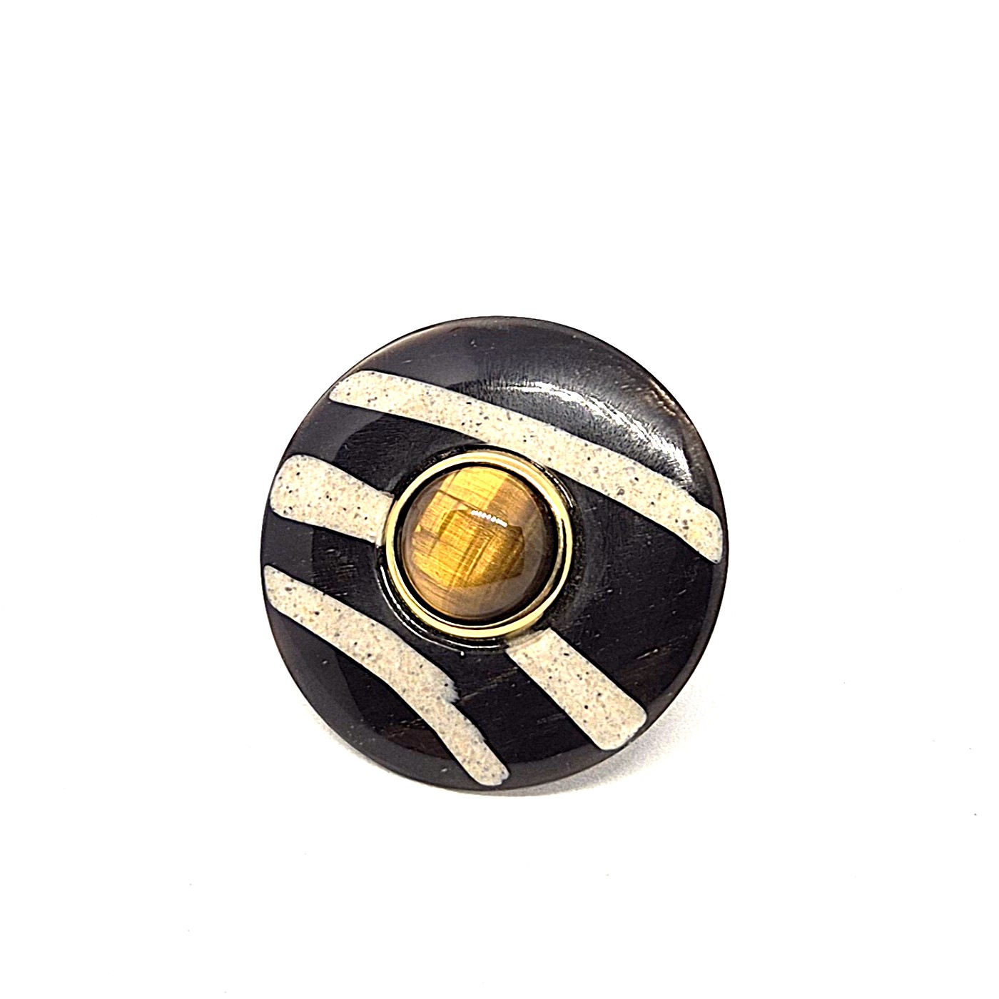 Bague réglable en laiton doré. Un disque zébré de corne et de sable résiné est surmonté d’un beau cabochon d’œil de tigre. Bague avec un beau volume et d’une beauté brute et raffinée.