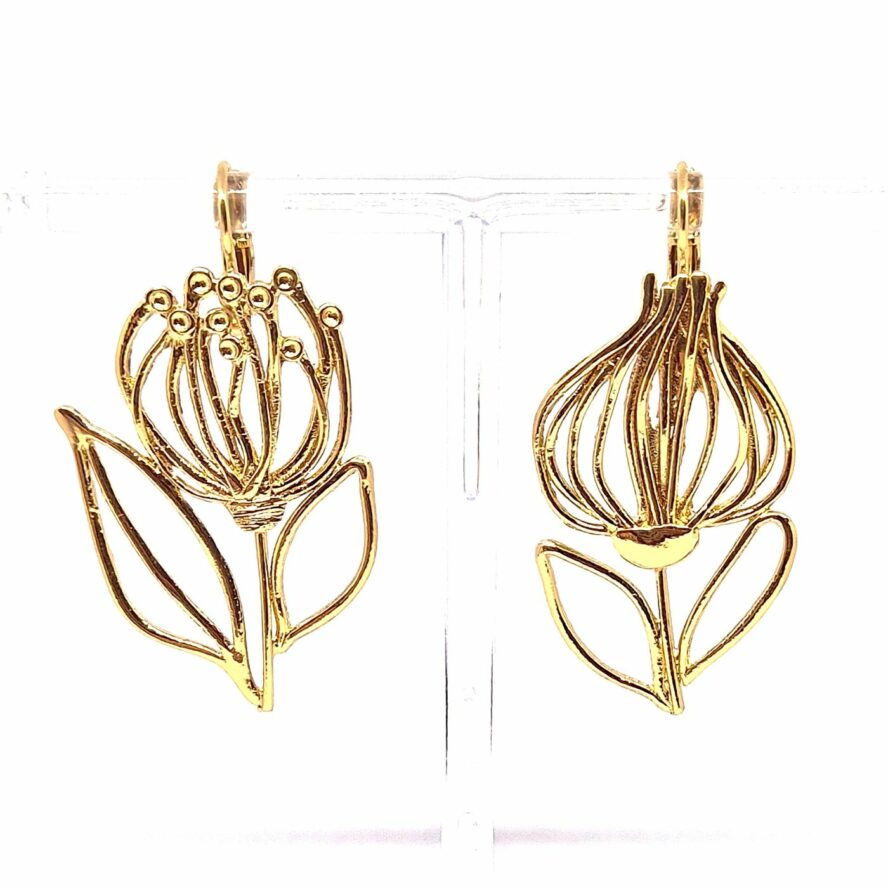 Dormeuses dépareillées en bronze doré à l’or fin. Les boucles sont légères et délicatement découpées