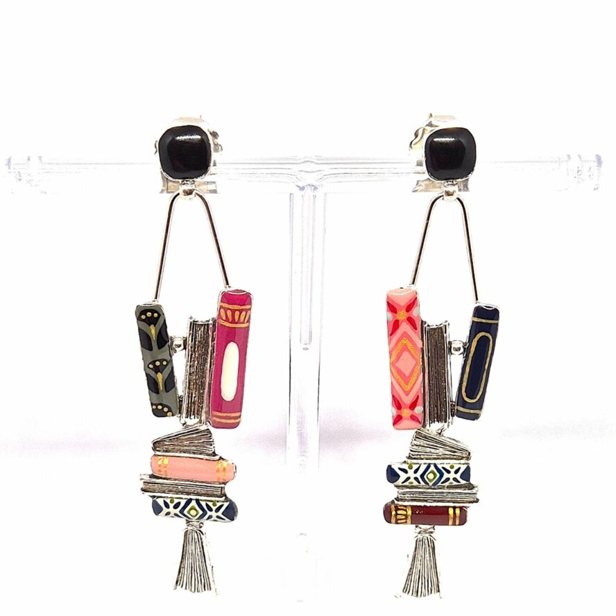 Boucles d’oreilles à tiges droites dépareillées en bronze argenté représentant des livres de forme et taille différentes. Ils sont peints à la main. Boucles légères et mobiles avec ses 2 parties articulées.