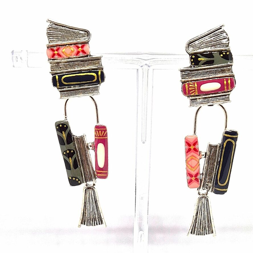 Clips dépareillés en bronze argenté représentant des livres de forme et taille différentes. Ils sont peints à la main. Boucles légères et mobiles avec sa partie articulée.