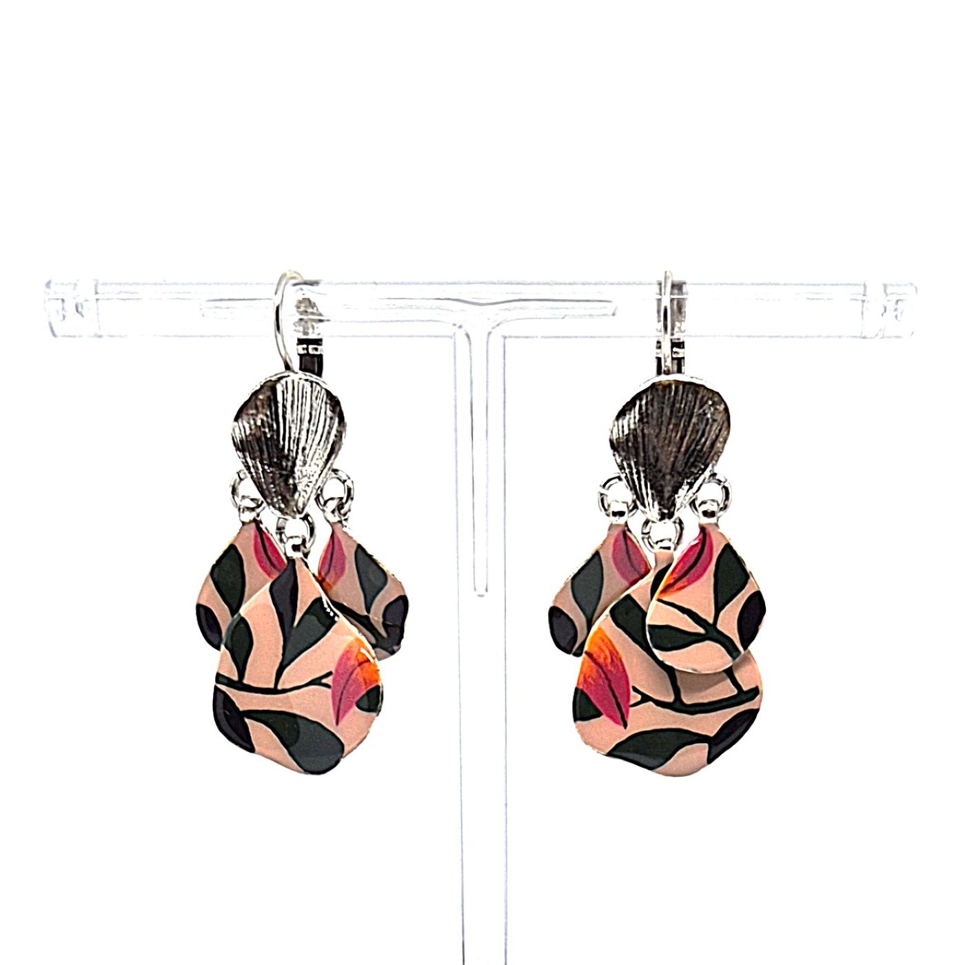 Dormeuses en bronze argenté. Les pampilles forment des feuilles incurvées, peintes à la main dans des tons de vieux rose et vert. Boucles légères et chic .