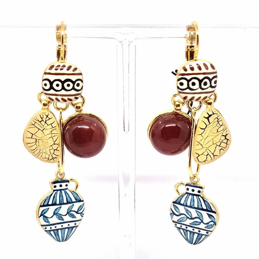 Dormeuses pendantes en bronze doré à l’or fin, composé de plusieurs pampilles. L’un des éléments représente un vase de couleur bleu et blanc. Les pampilles sont peintes à la main. Boucles légères et mobiles.