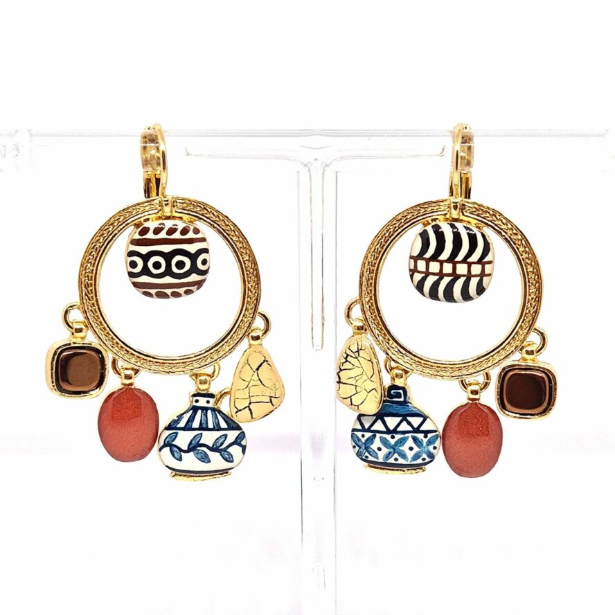 Dormeuses en bronze doré à l’or fin, composé de plusieurs pampilles. L’un des éléments représente un vase bleu et blanc. Les pampilles sont peintes à la main. Boucles légères et mobiles.