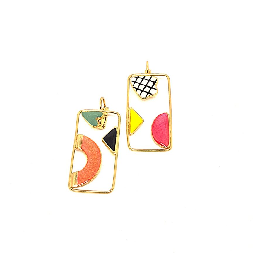 Dormeuses dépareillées en bronze doré à l’or fin. Visuel graphique et très coloré. Chaque éléments sont peints à la main. Boucles lumineuses avec ses couleurs pop et ses formes simples.