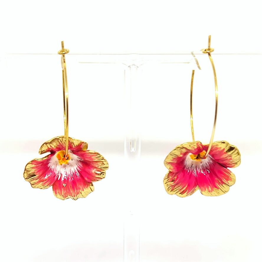 Créoles en bronze doré , la fleur émaillée dans les tons de rose. Boucles légères et délicates