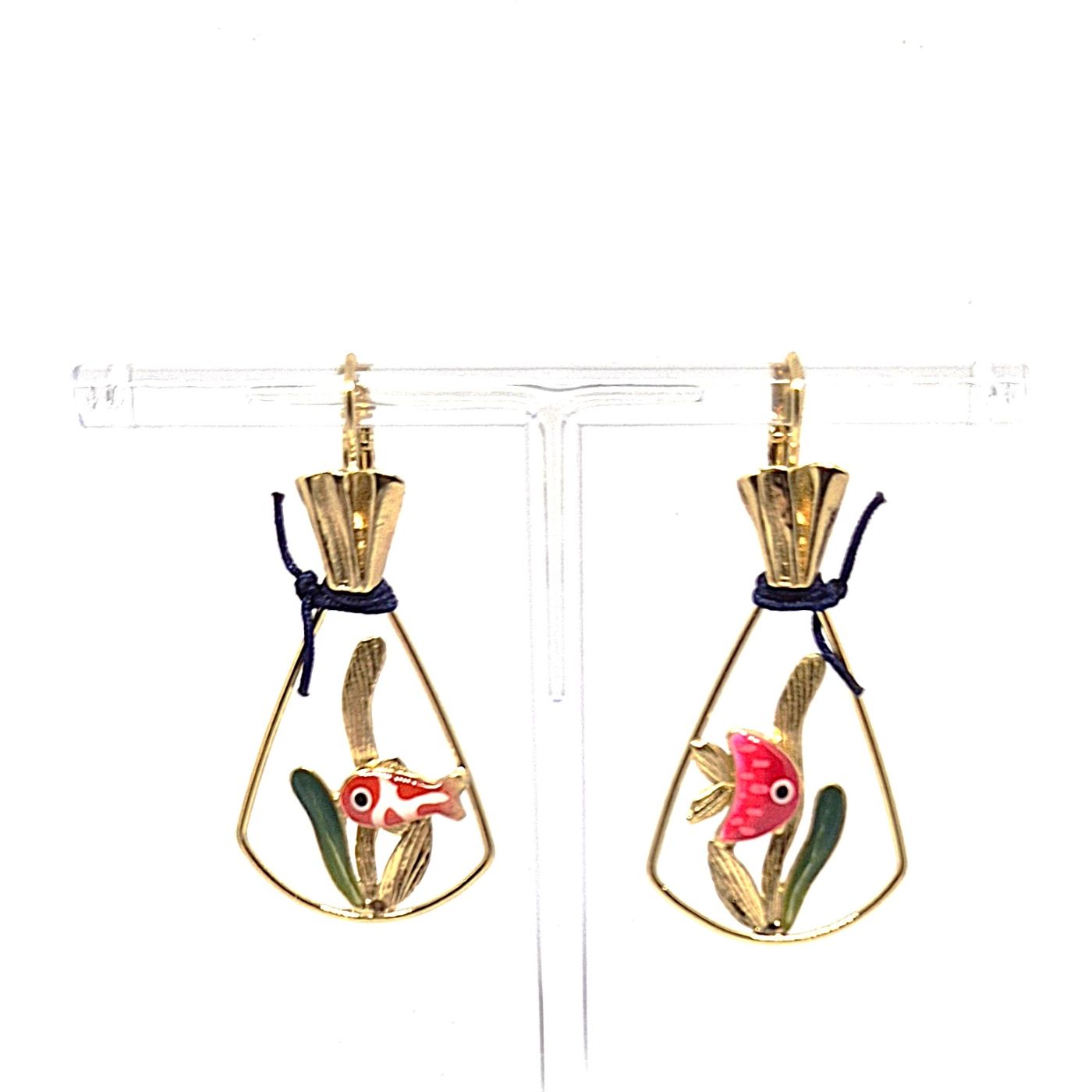 Dormeuses en laiton doré. Grâce au travail de découpe des éléments, les pendentifs représentent des sacs avec des poisson a l’intérieur. Les détails sont peints à la main dans des couleurs vives. Boucles légères et lumineuses.
