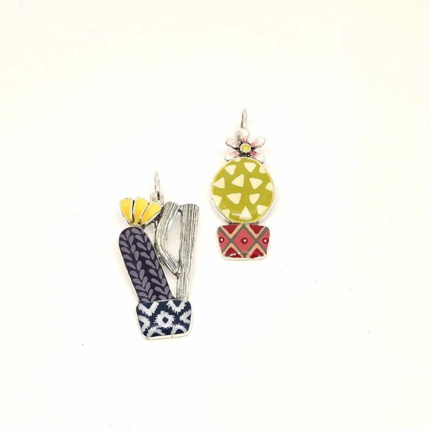 Dormeuses dépareillées en bronze argenté, représentant un ensemble de cactus , riche en détails et en couleurs. Chaque éléments sont peints à la main