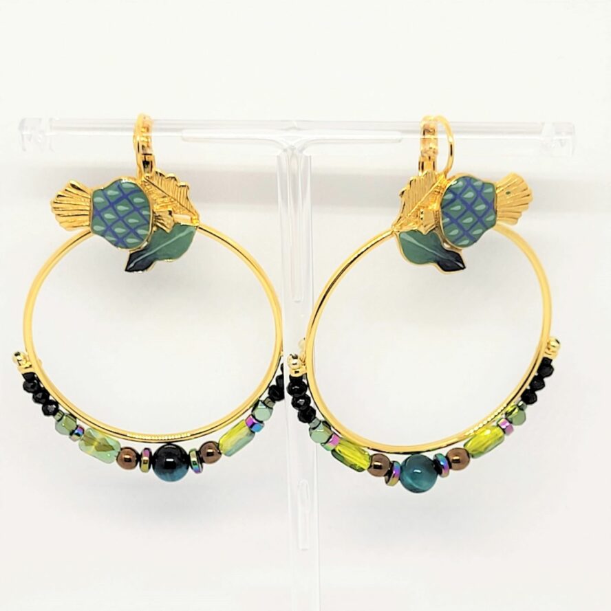 Dormeuses en bronze doré dans les camaïeux de bleus . Les chardons sont peints à la main et situés au niveau du lobe d’où part un cercle ajouré. Des perles de cristal irisées dans les bleus jouent avec la lumière et mettent a avant les perles d’apatite