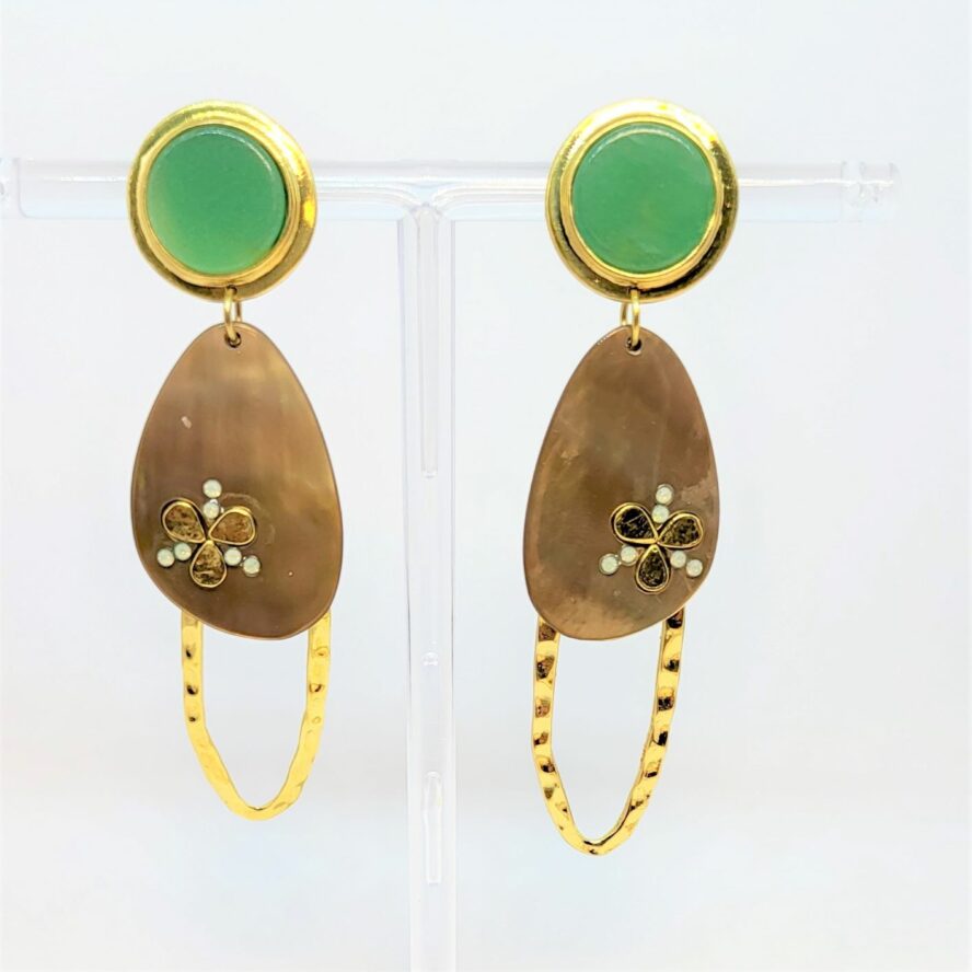 Clips en bronze doré, avec un disque d’aventurine sur le lobe(1.80 cm) Une pièces ajourée et martelée est associée avec un l’élément en nacre ( 3 cm sur 2 cm ). L’ensemble est léger et graphique et mobile. les éléments de nacres apportent la lumière tandis que l’aventurine une touche de couleur douce.