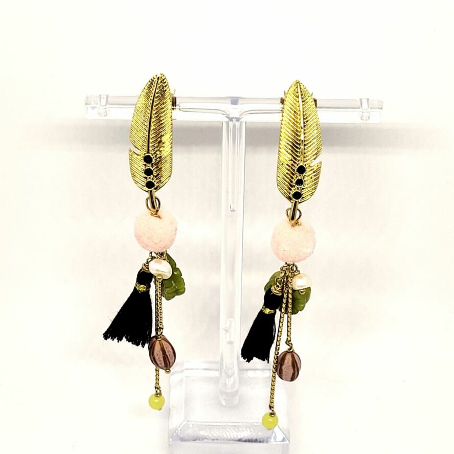 Clip en forme de feuille (3 cm sur 1 cm) en bronze doré avec quelques strass dessus. Deux fils avec un mélange de pierres et de perles se mélangent subtilement . La couleur douce de la jade se marie bien avec la perle de kumasi, le tout rehaussé par des perles de verres et cristaux. Boucles légères dans un style bohème chic .