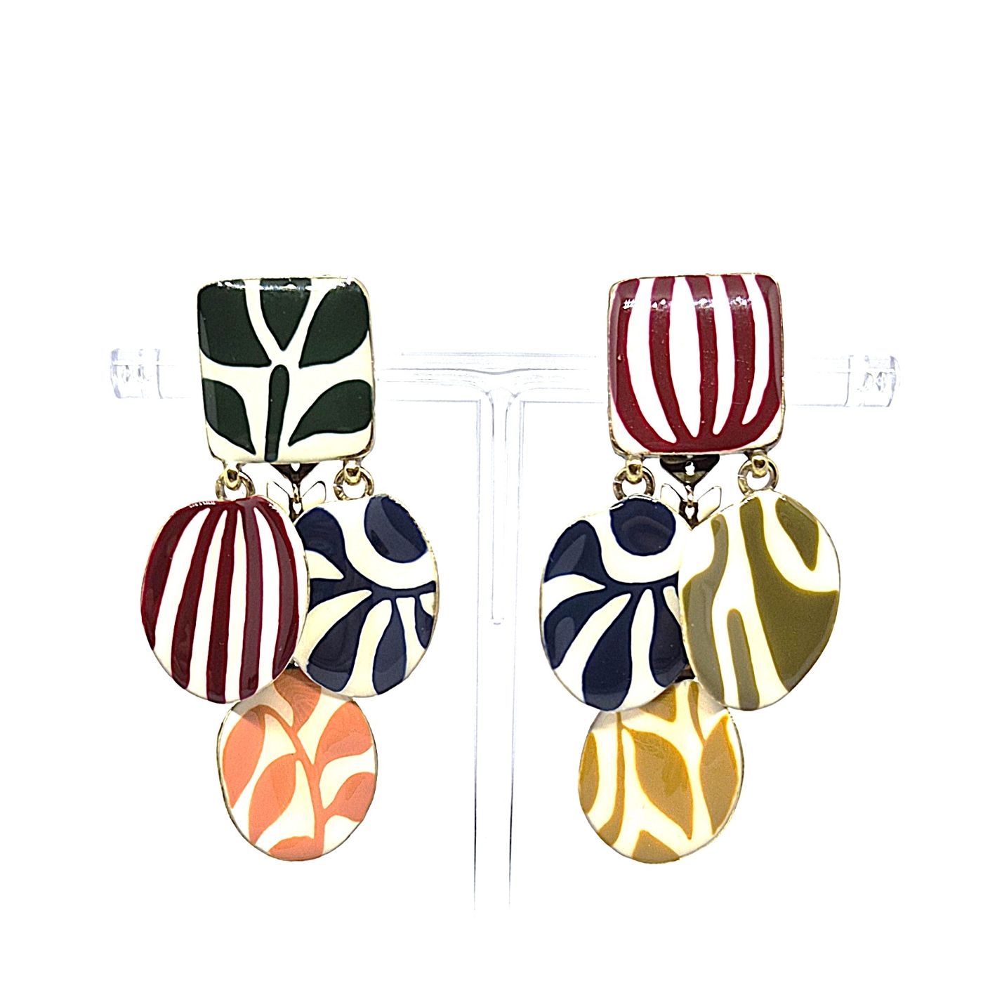 Clips dépareillés en bronze. Tous les éléments sont de forme, couleurs, et motifs différents. Tous les éléments sont peints à la main. La base de couleur crème, fait ressortir les motifs aux formes harmonieuses. Clips avec un bon maintient, faciles a assortir.