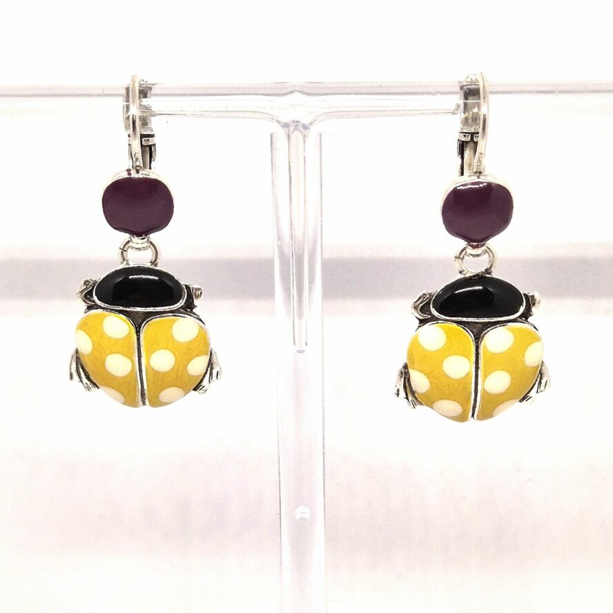 Dormeuses en bronze argenté représentant une coccinelle jaune à pois blancs, la pastille au dessus est de couleur prune . Elle est peinte à la main. La boucle est légère et mobile.