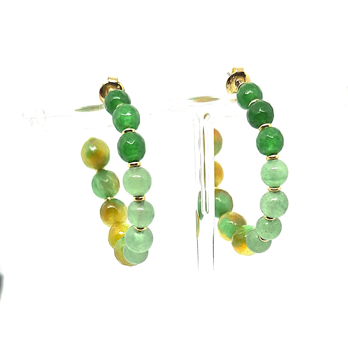 Créoles avec un dégradé de perles dans les camaïeux de vert. le jeu du travaille et de forme des perles est mise en valeur par une touche de doré.