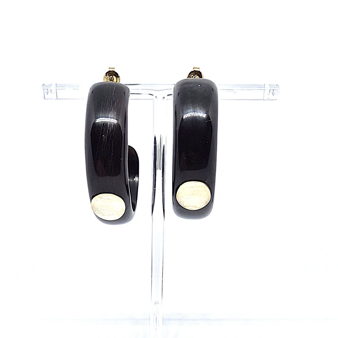 Créoles en corne, surmonté d’un cabochon de coquillage capiz résiné . Boucles sobres, lumineuses et chic.