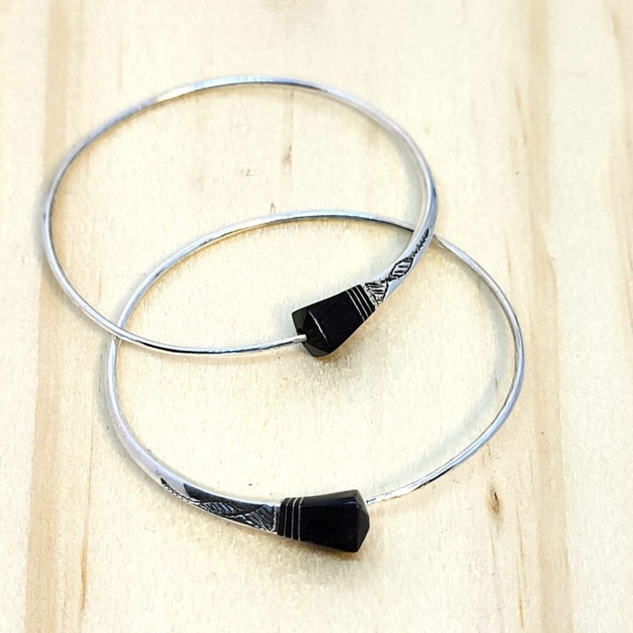 Créoles Touareg en argent .Elles sont fines et stylisées, l’ébène en forme de triangle est mis en avant par le travail délicat de l’argent.