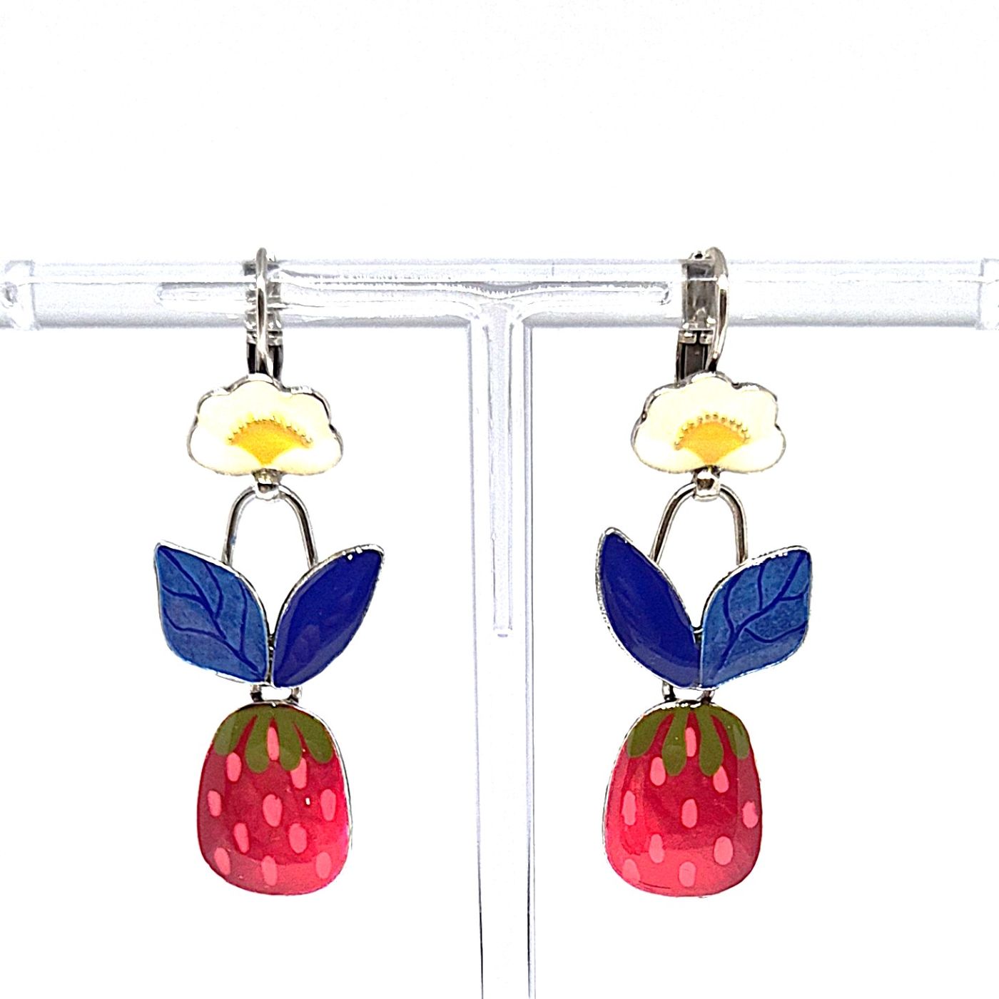 Dormeuses en bronze argenté. Les détails des fraises et des fleurs sont peints à la main. Boucles légères aux couleurs vives et contrastées.
