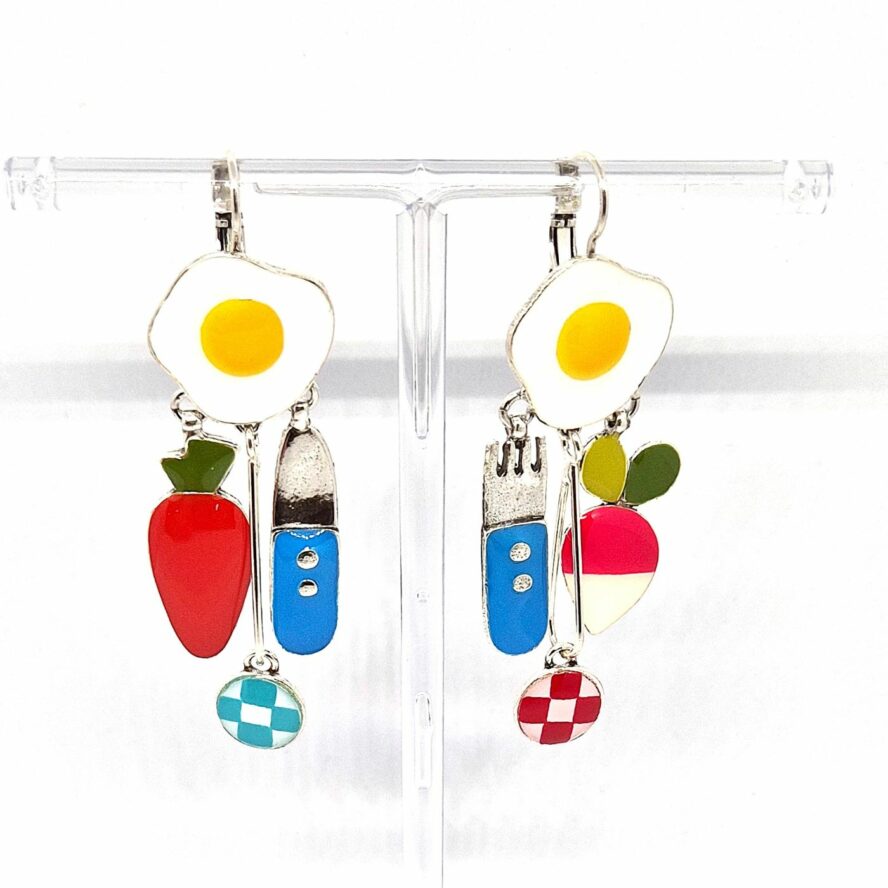 Dormeuses dépareillées en bronze argenté. Les éléments représentent des éléments de jeux pour enfants avec des couleurs vives . Chaque éléments sont peints à la main. Boucles légères et mobiles , grâce aux pampilles.