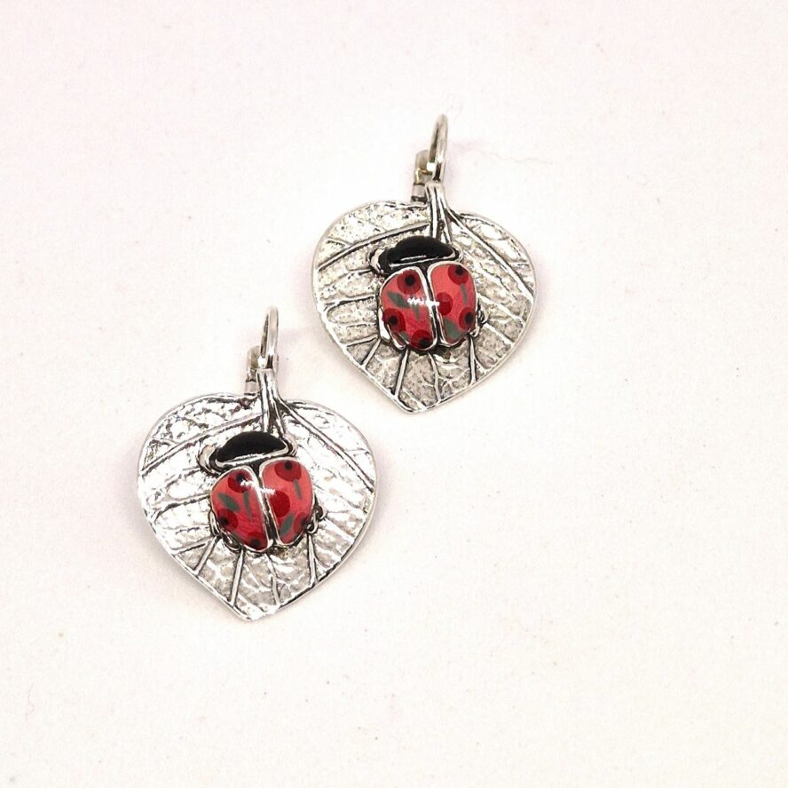 Dormeuses en bronze argenté représentant une feuille avec tous ces détails, sur laquelle est poséeune coccinelle rose avec des motifs de fleurs rouge. Elle est peinte à la main.