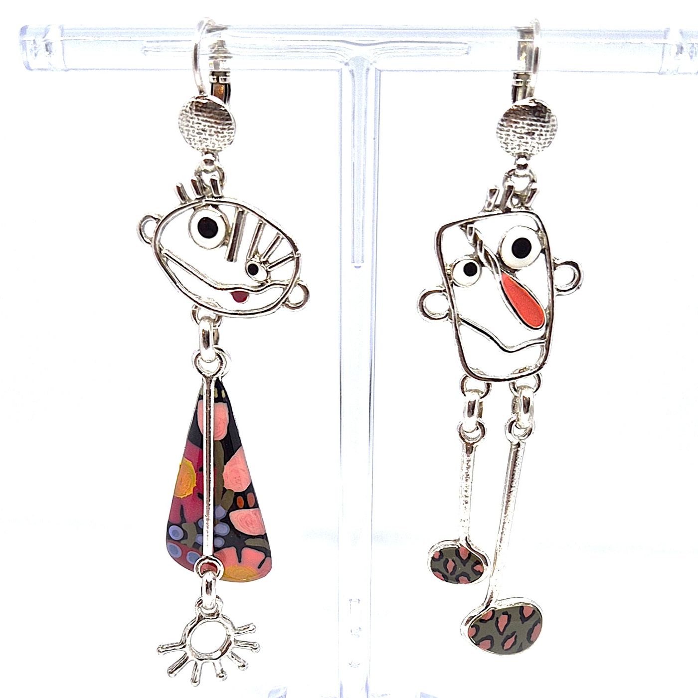 Dormeuses dépareillées en bronze argenté. Les personnages sont comme des dessins d’enfants, avec quelques touches de couleurs ( peint à la main). Boucles légères et tout en mouvement.