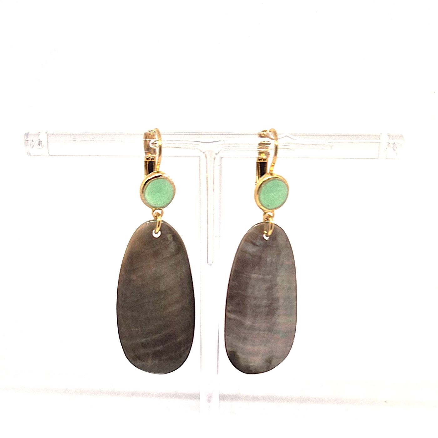 Dormeuses en laiton doré mettant en valeur les éléments de nacre grise, grâce à la présence d’une touche verte au niveau du lobe. Boucles légères et lumineuses.