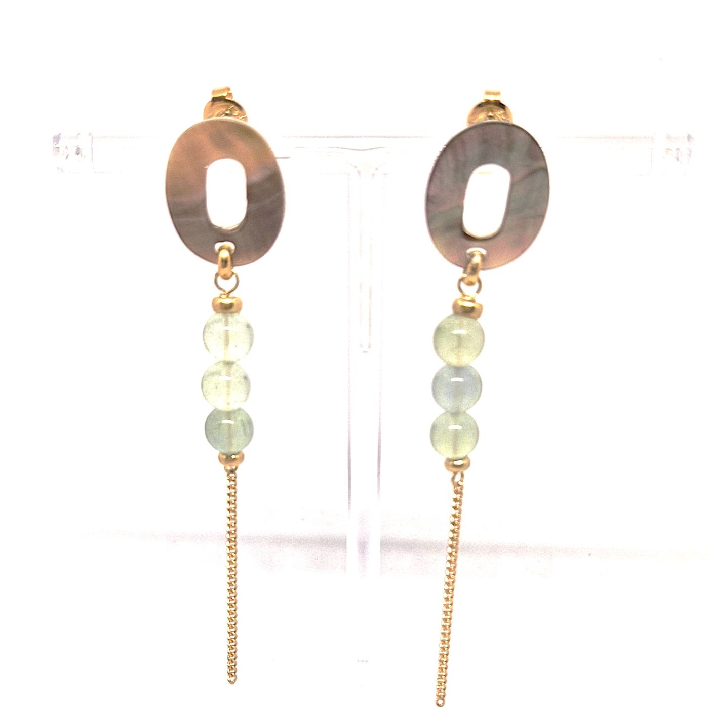 Boucles tiges droites en laiton doré mettant en valeur l’élément de nacre grise présente au niveau du lobe. Elle est soulignée par quelques perles de fluorites. Boucles aux teintes douces, légères et lumineuses